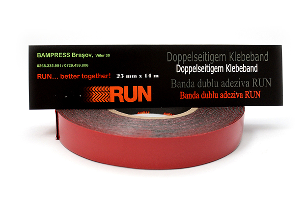 Bandă dublu adezivă , aderă pe majoritatea suprafeţelor vopsite în câmp electrostatic fără tratarea prealabilă a suprafeţelor. Construcţia benzilor este integral acrilică, rezistenţă excelentă la îmbătrânire şi vâscoelasticitate.